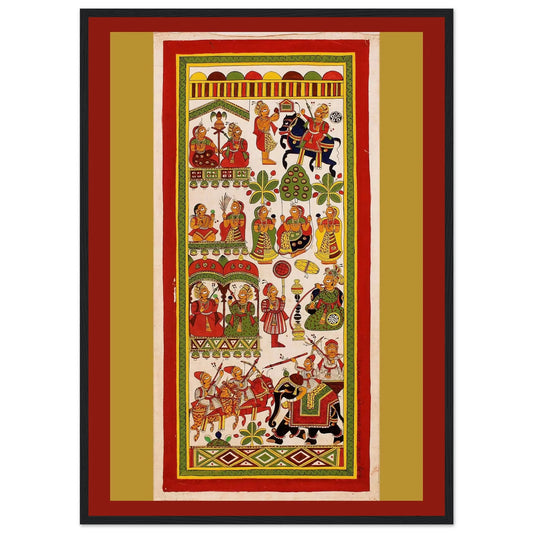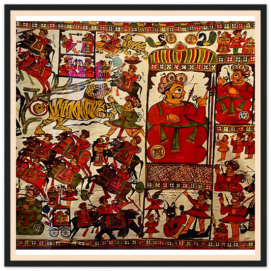 Phad-Gemälde sind voller Symbolik und stellen Geschichten von Göttern, Helden und dem Dorfleben dar. Jedes Gemälde entfaltet sich wie eine visuelle Geschichte, mit Szenen, die in einer Reihenfolge angeordnet sind, die epische Sagen erzählen.